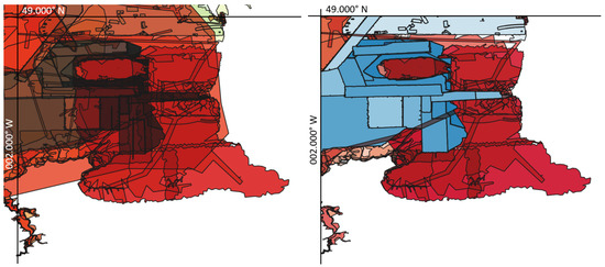 The first deconfliction performed is shown in Figure 9 which distinguished the stages before and after this process; each color represented the MSE of a survey. On this first tile (called 145_81, a name inspired by the Marsden square [30]), 115 surveys were used as input data and 441,418,088 associated soundings were processed. At the end of the processing chain, only 96 surveys were finally retained and 310,970,981 soundings were integrated into the Téthys. Of these bathymetric data, over 6000 soundings were digitized from old nautical charts.