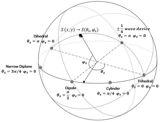 - The vector with an initial point on the sphere’s center and the terminal one given by the coordinates on the spherical shell is projected on the level of the equator to which the reference scattering mechanisms belong, based on the angle (Figure 3). Specifically, the projection is contained in the quadrant enclosed by the center of the sphere and the two closest to the examination point scatterers.