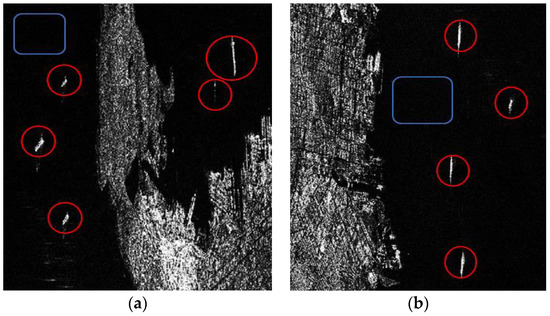 (a) Intensity of HV channel of PolSAR SLC data depicts a coastal area of Vancouver. Targets are in the red circles and clutter in the blue rectangle; (b) Intensity of HV channel of PolSAR SLC data depicts a coastal area of San Francisco. Targets are in the red circles, the clutter in the blue rectangle.