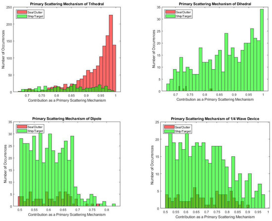 The present technique focuses on the statistical description of the Polarimetric cells by means of the contributions of the primary and secondary scattering mechanisms, according to the applied decomposition. For this reason, the histograms for each scattering mechanism corresponding in both target and clutter cells were calculated as a function of the number of occurrences in these regions.