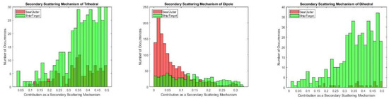 Histograms of the contribution rate of each secondary scattering mechanism and the number of occurrences in both target and clutter PolSAR cells.