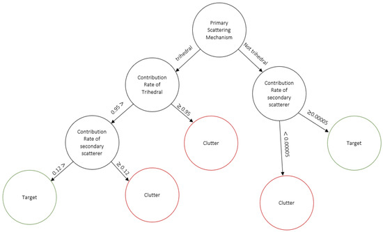 - If the primary scatterer is the trihedral mechanism of two branches, follow based on the contribution rate. Specifically, if the contribution rate is higher than the cell is characterized as clutter/sea, otherwise an additional split is needed. The left-hand branch (Figure 7) is indicated, according to which, if the contribution rate is less than , the cell is labeled as a target, otherwise it is assumed to be clutter.