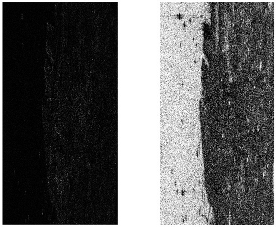 Coastal area of Thailand as depicted by the amplitude of channel HV in a grayscale format (Left). Binary image as constructed based on the proposed decision tree (Right) according to which the white color corresponds to sea/clutter and the black to candidate targets.