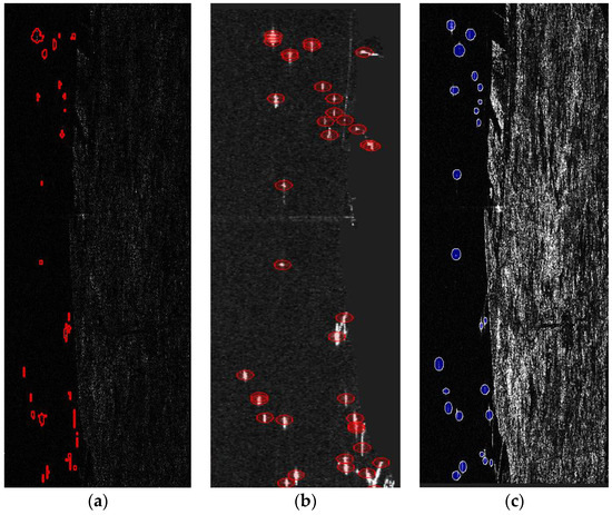 (a) Ship detection based on the proposed algorithm, Thailand; (b) Ship detection based on the CFAR and Lee filtering, Thailand; (c) Ship detection based on visual inspection, Thailand.