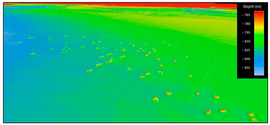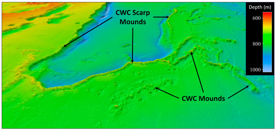 Multibeam sonar systems have enabled ocean scientists to map complex CWC mound and reef habitats remotely from surface ship hull-mounted sonars (example shown in Figure 1 for the Richardson Mounds subregion of this study). The resolution of these seafloor maps is directly related to the depth of the seafloor and the angular resolution of the particular multibeam system, but it should be possible to resolve mound features using this tool to a depth of approximately 1500 m depending on the sonar, surveying conditions and speed, and size of the mound features. Multibeam and sidescan sonar systems mounted on remotely operated vehicles (ROVs) and autonomous underwater vehicles (AUVs) can reach close to the seafloor and thereby obtain much higher resolution maps of CWC mounds—typically centimeters to tens of meters resolution depending on the height above the seafloor [25,26]. These systems provide higher resolution but smaller areas of coverage than ship-mounted multibeam sonars. Fine-scale ground-truth data on seafloor substrate character and biological communities at CWC sites is made possible through the use of towed or dropped camera systems, and via video data collected by AUVs, ROVs, and human occupied vehicles (HOVs) that can capture views of these habitats within meters of the seafloor.