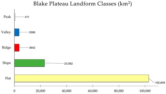Cumulative areas were calculated for each of the five geomorphic landform classes: peaks (411 km2), valleys (3598 km2), ridges (3642 km2), slopes (23,082 km2), and flats (102,848 km2). Figure 7 provides a bar graph of these results. While flats make up the largest area, the other four classes collectively cover an area of 30,733 km2 and comprise the complex CWC mound and steep scarp features in the region. The aggregated area of peak features alone covers an area 7× the size of the island of Manhattan in New York City, and the area covered by peaks and ridges (where living corals are most likely to be found) together comprise an area larger than Yosemite National Park. Terrestrial protected area size comparisons are noted to prompt the reader to consider the ecosystem services provided by these important marine habitats at such a scale. These ecosystem services include carbon sequestration, nutrient regeneration, and biodiversity support, among others described in detail in a separate study focused on the Richardson Reef area [55]. A valuation of estimated ecosystem services for the Blake Plateau CWC mound province is beyond the scope of this study, but the initial characterization provided here provides a basis upon which further assessment can be undertaken.