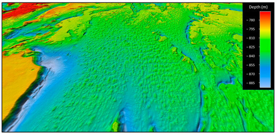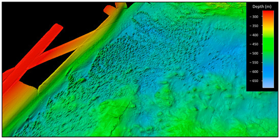 Three-dimensional views of the bathymetry for each of the subregions (A–H) are shown to provide a visual contrast of the diversity of mound pattern formation and density across the Blake Plateau. Jellyfish Mounds (A) are shown below in Figure 9. Richardson Mounds (B) have already been shown above in Figure 1. Subregions C–G are shown in Figure 10, Figure 11, Figure 12, Figure 13 and Figure 14. The central region of the large Million Mounds subregion (H) is shown in Figure 6, and the southern region of Million Mounds is shown in Figure 15. All bathymetry grids shown are 35 m resolution and projected to WGS84, UTM 18N.