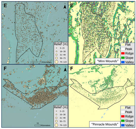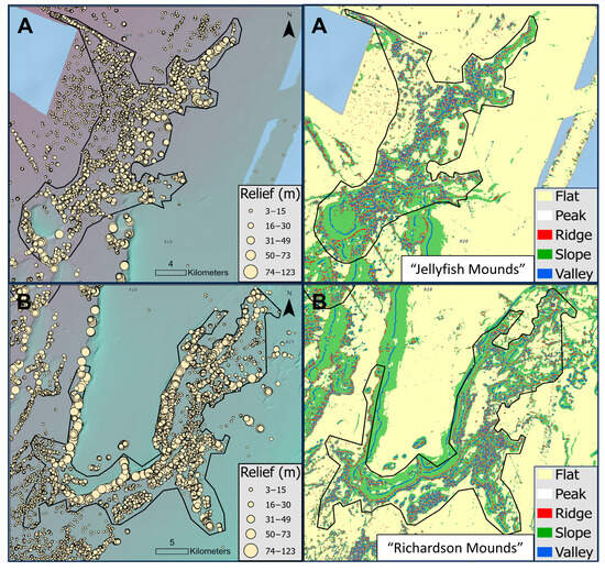 Additional maps of each subregion are provided in Figure 16, Figure 17, Figure 18 and Figure 19. The left panels display graduated symbols of mound relief overlain on hill-shaded bathymetry, with each circle representing an individual mound feature. The larger the beige circle, the greater the vertical relief of the mound. These maps quickly provide a visual display of mound densities and relative relief across the bathymetric grid. The right panels display the unique spatial patterns of geomorphic landform classes of the subregions (“fingerprints”) and provide an immediate visual contrast between flat areas and complex terrain. Letters in the top left corner correspond to the letters in the Figure 8 overview map. Black outlines in the figures are the polygons delineated for the purpose of quantifying and contrasting metrics about the nature of mounds in each subregion.