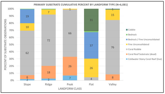 Plot of primary substrate types observed for each landform class based on interpretation of submersible video data. The y-axis represents the cumulative percent of substrate observations aggregated for each landform class.