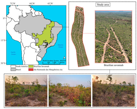 The study was conducted in the municipality of São Raimundo das Mangabeiras, located in the southern region of the state of Maranhão, northeastern Brazil (Figure 1). The study area is located at 45°31′06″ W and 07°00′54″ S, at an altitude of 236 meters above sea level. It belongs to the Cerrado biome, which is characterized by a savanna-like phytophysiognomy, featuring low, twisted trees with irregular branches, often displaying burn marks, with tree cover ranging from 20% to 50% and an average height of 3 to 6 meters. Shrubs and subshrubs are dispersed throughout the area, with some species possessing perennial underground structures that enable regrowth after fire or cutting. During the rainy season, the subshrub and herbaceous strata become lush due to rapid growth [15].