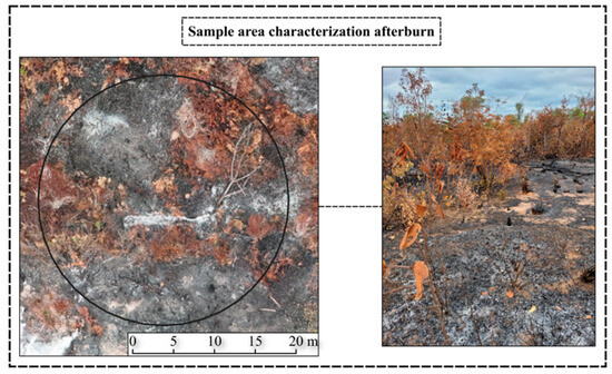The time interval between the pre- and post-fire surveys was 22 days. After the fire, a ground inspection was carried out to verify in situ the locations where the vegetation was completely burned. Twenty circular plots with a diameter of 20 meters were previously marked for this purpose (Figure 2).
