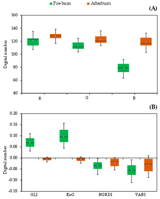 Upon analyzing the data, it is evident that all the bands (Figure 4A) showed higher digital values in the images obtained after the burning event. The R and G bands exhibited a slight overlap between the pre- and post-fire values. In contrast, the B band showed a significant differentiation between the pre- and post-fire digital values, with a notable increase in digital numbers after the fire event.