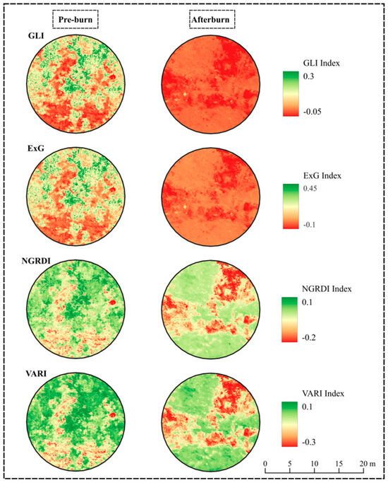 The GLI and ExG indices, in addition to being more sensitive to changes in vegetation, showed a greater capacity to represent the absence of green vegetation after the fire. Meanwhile, the NGRDI and VARI indices displayed lower contrast between green and non-green vegetation, making it more challenging to distinguish burned areas.