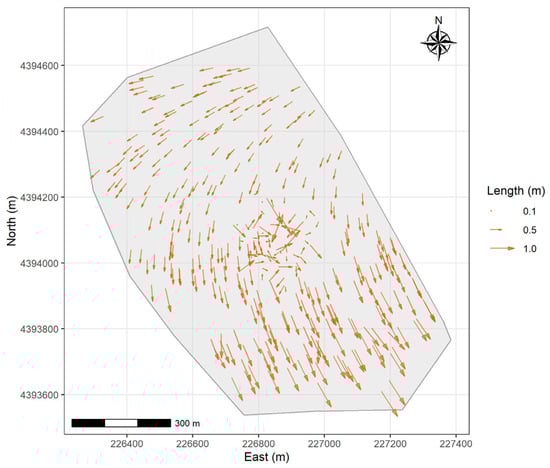 where and Δ are the differences along the x and the y-axis, respectively, for a point . In this form, the vector represents the coordinates from the 2025 digital cadastral map and from the digital 2001 land survey, both in HGRS87. The magnitude of the error vector (i.e., the length) was also calculated for every point .