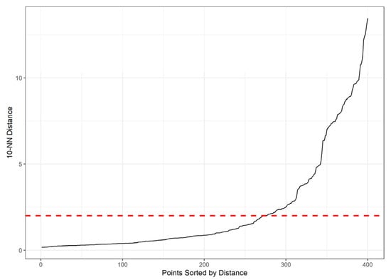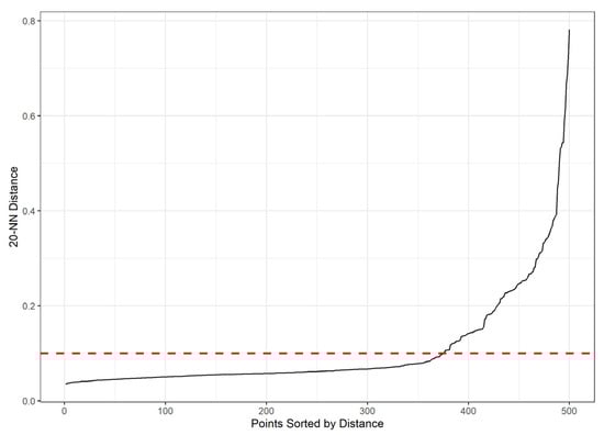 In our cadastral error analysis, the input data points to DBSCAN are the error vectors (. The parameter describes a distance in the error space, and represents the minimum number of points with similar error magnitudes and directions required to form a cluster. A suitable parameter can be selected using the k-nearest neighbor (kNN) distances for the dataset, represented as a matrix of points []. The kNN distance is defined as the distance from a point to its k-nearest neighbor (i.e., k, which corresponds to ) []. The algorithm was implemented using the ‘kNNdistplot’ and ‘dbscan’ functions from the ‘dbscan’ R package [].