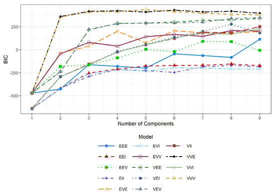 - Scrucca, L.; Fraley, C.; Murphy, T.B.; Raftery, A.E. Model-Based Clustering, Classification, and Density Estimation Using Mclust in R; Chapman and Hall/CRC: Boca Raton, FL, USA, 2023; ISBN 978-1-032-23495-3. [Google Scholar]