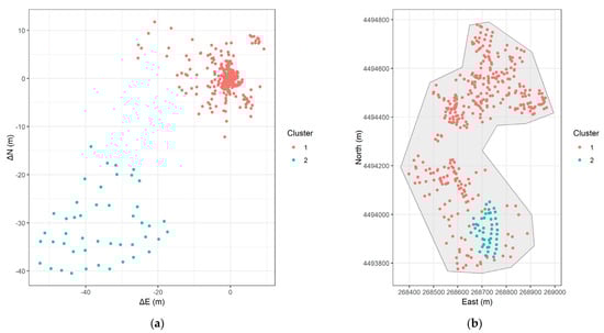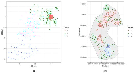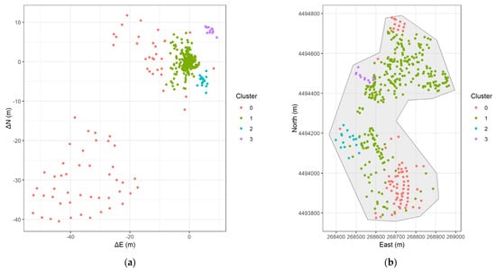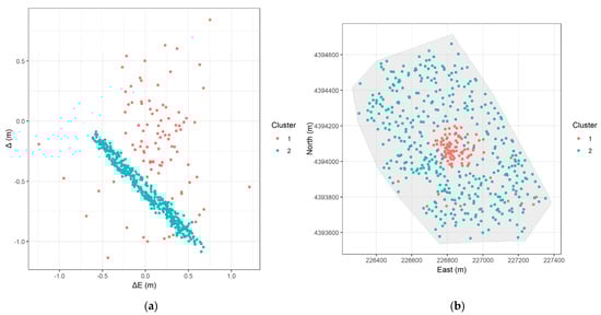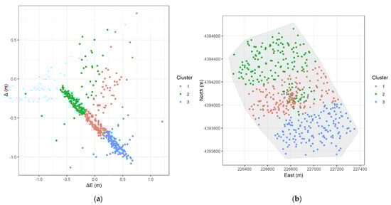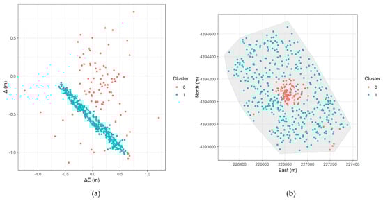 As already mentioned, clustering groups data points is based on a predefined similarity measure, without prior knowledge of the group labels. In this context, the goal is to group homologous points that have similar error values , to reveal underlying spatial structure in the error distribution. If the errors were distributed randomly across the study areas, clustering would likely produce arbitrary groupings without meaningful interpretation. Nonetheless, we make the hypothesis that systematic errors will be expressed as spatially district patterns. All analyses was performed using the R language (version 4.4.2) [] and the packages ‘cluster’ [], ‘dbscan’ [], ‘mclust’ [], ‘factoextra’ [], ‘ggplot2’ [], and ‘sf’ [].