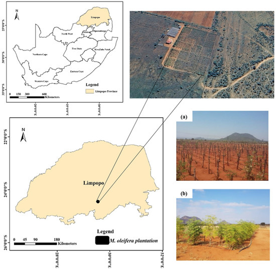 M. oleifera plantation (cultivar PKM-1) was established in 2013 and spans an area of approximately 1.4 ha (120 m × 120 m). The soil texture within the farm is a loamy sand, with 78–84% sand, 2–4% silt, and 14–18% clay. Trees were planted at a spacing of 2 m × 2 m and irrigated by means of a drip irrigation system, with one emitter per tree delivering 1.6 L.h