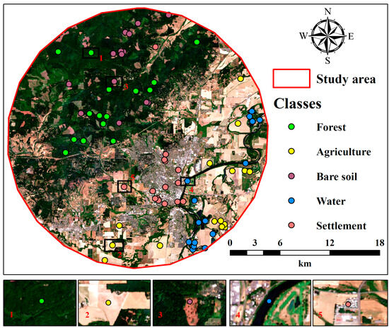 Land use/cover classification involved areas surrounding the city of Corvallis (OR, USA) with the RF and CART machine learning algorithms. The main study area, situated at approximately 44.603° N, −123.301° W, has a temperate oceanic climate with rainy winters and dry summers, which influences vegetation patterns and seasonal land cover dynamics—an important factor for LULC modeling using remote sensing data. The GEE code editor and its provider services were used as a calculation platform. Sentinel-2R satellite images involving the summer season (between 1 April 2023 and 31 July 2023) were analyzed. To compare and check the accuracy of the classifiers, additional training and test subsets were added for each class. In the study, five land classes were evaluated with a range spanning 75 to 2500 ground sampling points created for each class (Figure 1). An accuracy analysis of classifications was also performed for both the RF and CART techniques. Then, differences in the generated land use/cover maps were used to compare the results of CART and RF. For image classification, different training and test datasets were used for different combinations. In this study, land use/cover classes were divided into five groups, which were represented as “1 = forest”, “2 = agriculture”, “3 = bare soil”, “4 = water”, and “5 = settlement”. The settlement category includes urban features such as buildings, roadways, and all infrastructure components in the area.