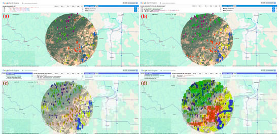 GEE code editor interface and the spatial distribution of 75 (a), 150 (b), 300 (c), and 2500 (d) training and testing datasets. (Each colored pinpoint represents a LULC class: forest is green, agriculture is yellow, bare soil is purple, water is blue, and settlement is red).