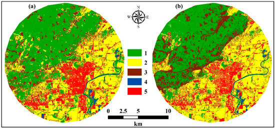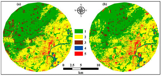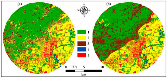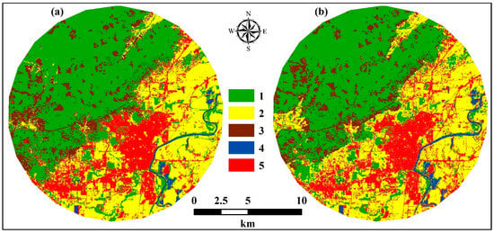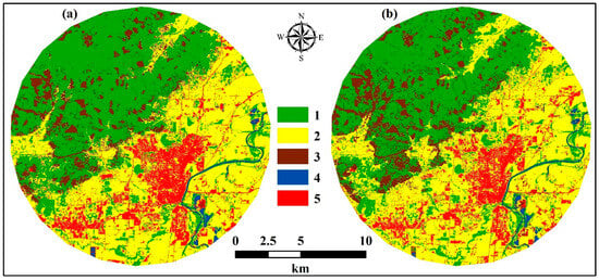 Classification maps of RF (a) and CART (b) created using 300 training and test data points for composite indices.