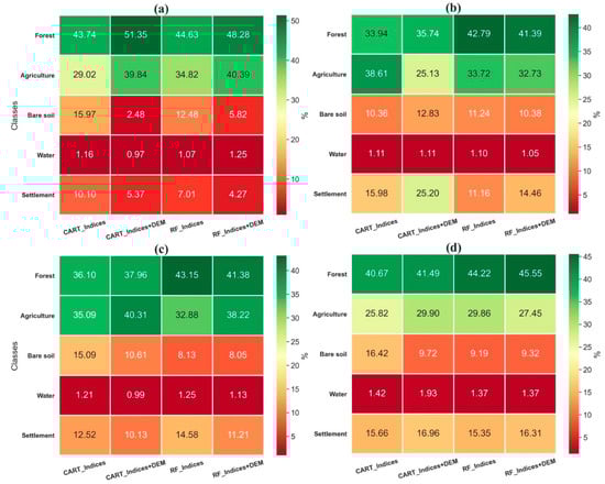 The heatmap presents the area (%) information of LULC classes for 75 (a), 150 (b), 300 (c), and 2500 (d) training and test points.