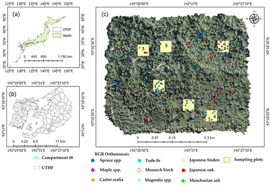 The study area map: (a) location of the UTHF in Japan; (b) location of the forest compartment 68 in the UTHF; (c) tree spatial positions (n = 255) of field-measured tree species and sampling plots (n = 6) for evaluating individual tree crown detection, visualized in the UAV RGB orthomosaic with plot numbers (1–6).