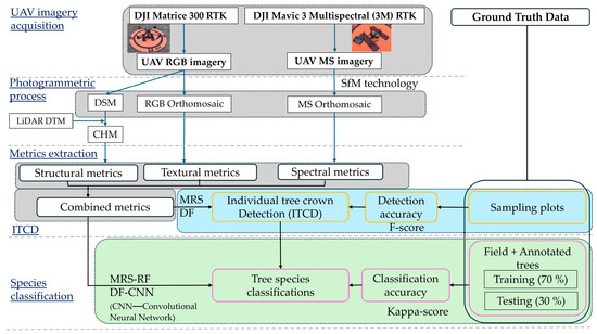 The workflow of the individual tree crown detection and species classification. UAV—unmanned aerial vehicle; RGB—red–green–blue; MS—multispectral; RF—random forest; DF—DeepForest; DSM—digital surface model; LiDAR DTM—light detection and ranging digital terrain model; SfM—structure from motion; CHM—canopy height model; MRS—multiresolution segmentation; CNN—convolutional neural network; ITCD—individual tree crown detection.