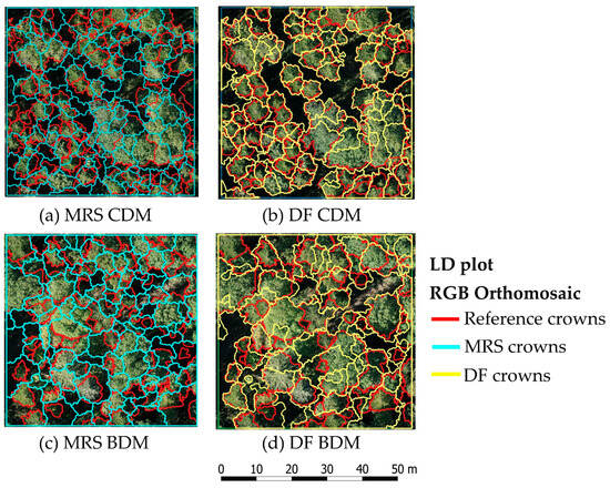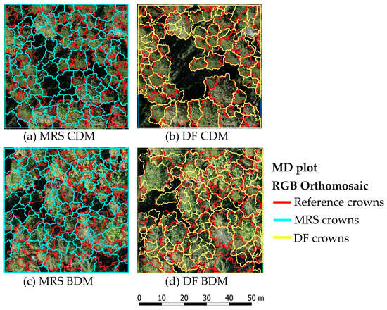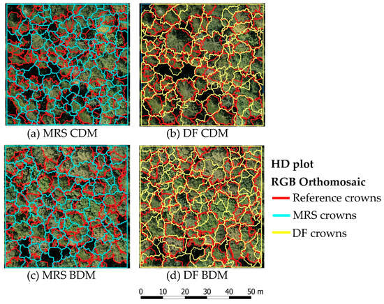 The individual tree crown detection of MRS and DF in MD plot. (a) MRS in CDM plot; (b) DF in CDM plot; (c) MRS in BDM plot; (d) DF in BDM plot.