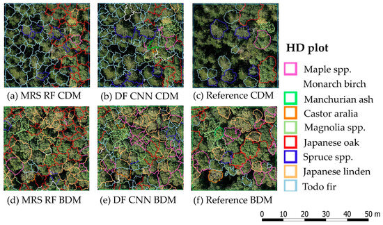 The results of MRS-RF and DF-CNN tree species classification with the reference tree species crowns in CDM and BDM plots for the MD plots. (a,d)—MRS RF species prediction in CDM and BDM plots, respectively; (b,e)—DF-CNN species prediction in CDM and BDM plots, respectively; (c,f)—reference tree species crowns in CDM and BDM, respectively.
