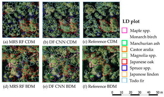 The results of MRS-RF and DF-CNN tree species classification with the reference tree species crowns in CDM and BDM plots for the LD plots. (a,d)—MRS RF species prediction in CDM and BDM plots, respectively; (b,e)—DF-CNN species prediction in CDM and BDM plots, respectively; (c,f)—reference tree species crowns in CDM and BDM, respectively.