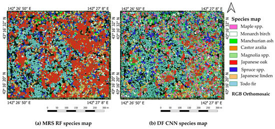 Figure 9 displays the tree species classification map of MRS-RF and DF-CNN models. Both models showed similar predictions of tree species classification. However, MRS-RF (Figure 9a) notably overpredicted Japanese oak, misclassifying species such as Manchurian ash, Maple spp., and Japanese linden as Japanese oak, consistent with Table 7 (confusion matrix). In contrast, DF-CNN prediction (Figure 9b) showed fewer misclassifications, consistent with Table 9 (confusion matrix). The gaps were accurately predicted by both MRS-RF and DF-CNN; however, for mapping in this study area, only tree species were displayed, with gaps excluded.