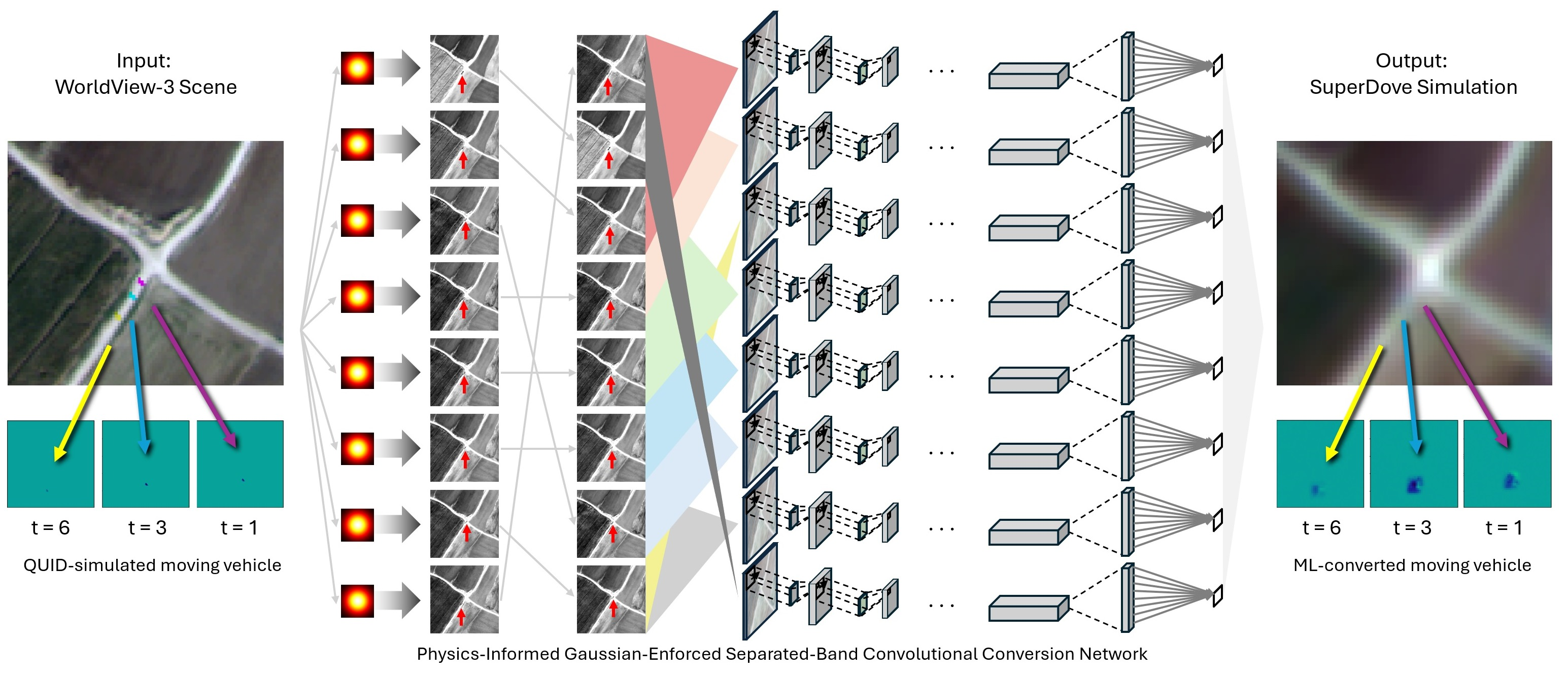 Figure 2, first separates out each band of the input image with band-specific Gaussian blurs derived from analysis of identical contrast targets in both the WV (input) and SD (output) domains. Specifically, we incorporate specific Gaussian blurs scaled by factors of 4.2576, 4.2679, 4.2670, 4.2498, 4.2841, 4.4390, 4.2026, and 4.3625 for the 8 image channels, respectively. We incorporate that physical knowledge to inform the model, instead of just hoping the ML model parameters learn the correct relative blurring. We then rearrange the order of the input scene bands by temporal acquisition. This rearrangement informs the model of the correct physical time progression, instead of just hoping the ML model parameters learn the correct band reordering. Once reordered, we chunk the image into 8 temporally adjacent 3-band sections. The first and last chunks at the temporal periphery repeat their earliest and latest bands, respectively, to yield 3-band chunks the same shape as temporally internal chunks. Then, the physical knowledge that correct output has band-localized object positions further informs our design of the model architecture, as separate convolutional branches per output image channel, instead of just hoping the ML model parameters learn correct band separation. Thus, after sectioning, these temporal chunks are then rearranged back into the original spectral ordering. Then, each of the 8 3-band chunks are fed through separate parameterized convolutional network paths to obtain a prediction for each band, and ultimately, a converted spectra for each pixel of the input image. In these ways, our knowledge of the physical system informs our methodology, solidifies known relationships between the data, and ameliorates spurious blur, band reordering, and band mixing errors that may otherwise manifest with a non-physics-informed basic convolutional approach.