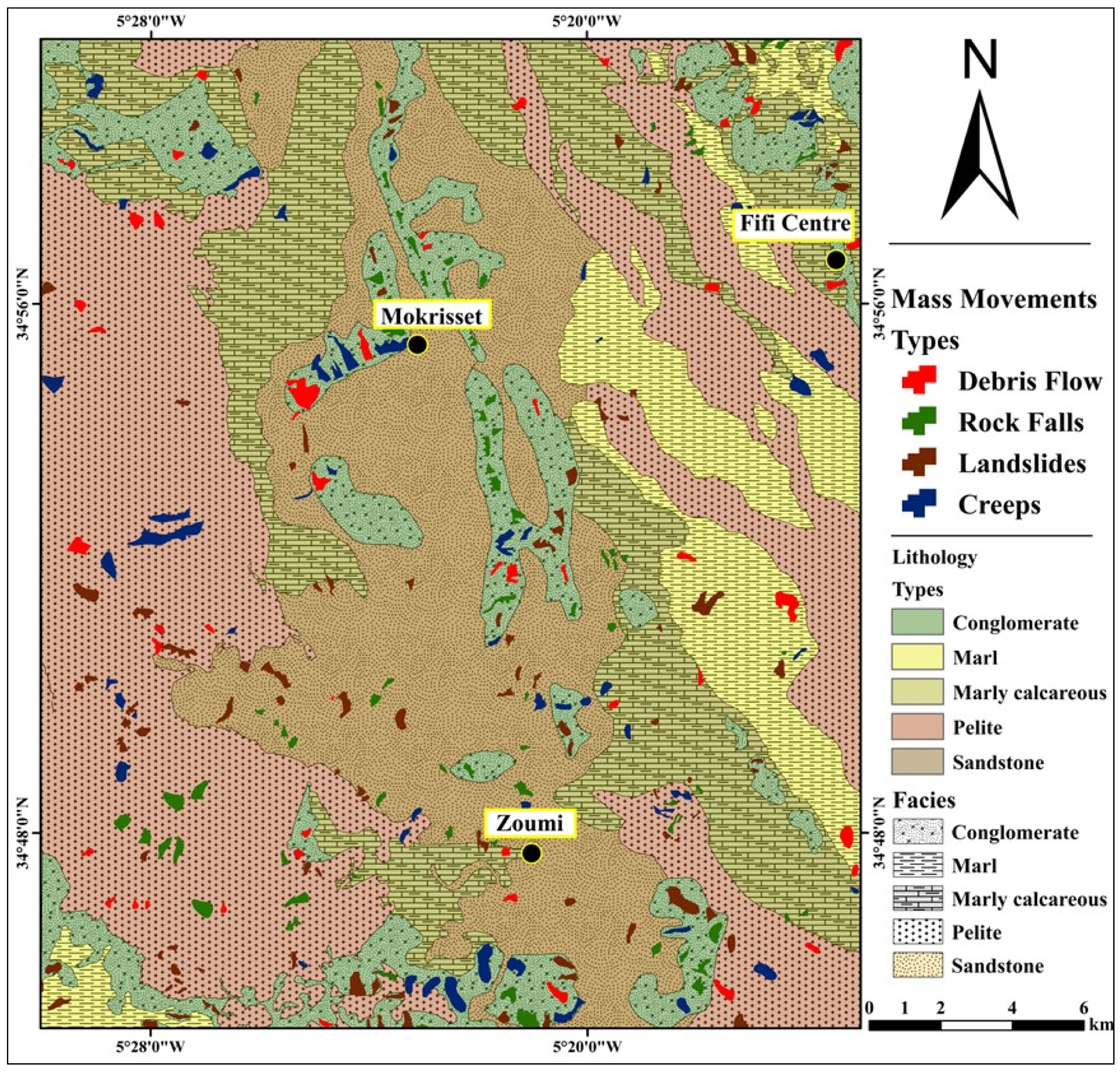 - Boukhres, N.; Fressard, M.; Thiery, Y.; Mastere, M.; Benzougagh, B.; Fellah, B.E. Mass movement inventory map of the Dhar Souk region and its main spatial morphometric characteristics. Bull. L’Institut Sci. Sect. Sci. Terre 2024, 46, 15–39. [Google Scholar]