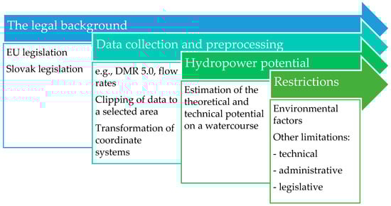 The methodology can be divided into four main steps, which are closely linked to each other. The first step includes the study of the legislative basis related to the issue of hydropower use in the conditions of Slovakia. The second step consists of the collection and preprocessing of input data into GIS. The next step is the estimation of hydropower potential on watercourses. The last step is the addition of other criteria and factors influencing the selection of a site for a hydroelectric power plant based on legislative requirements. These steps are illustrated in the following Figure 2.