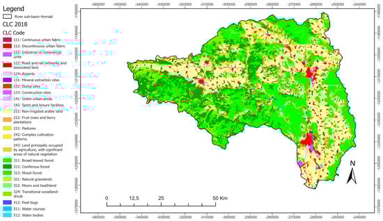 The study area (Figure 1) consists of the Hornád sub-basin and belongs to the international Danube basin. The area of the Hornád sub-basin is 4420 km2. The total length of the Hornád river in Slovakia is 178.8 km []. The Hornád sub-basin is covered by forests, with an area of 2142 km2 (forest cover 48.5%) [].