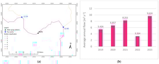 Average annual flow values at water meter station 8870: (a) spatial location of points of interest with water meter station; (b) average annual flow values at station 8870 in 2019–2023.