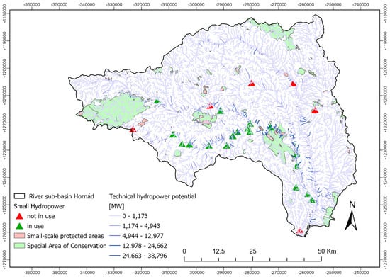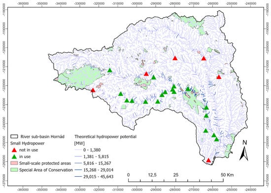 Small hydropower plants use a relatively low head to generate electricity, which can be less than 10 m []. This head is naturally available in watercourses. In our study, we considered a head equal to or greater than 10 m. Given the nature of the Hornád sub-basin, according to the DMR, the lowest value is 157.9 m, the highest is 1938.2 m, and approximately 61% of watercourse sections have a head greater than or equal to 10 m.