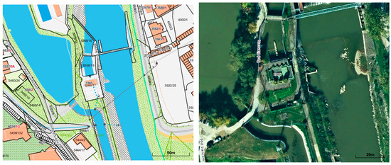 Figure 10 shows an example of a water structure recorded in the real estate cadaster information system. The water structure with inventory number 3385 is registered as a small hydroelectric power plant (Figure 10a) with an orthophoto image in Figure 10b. Part B of the title deed lists the owner with the title of acquisition by a 50-year lease agreement.