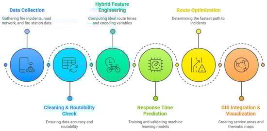 In recent years, Geographic Information Systems (GIS) and machine learning (ML) techniques have shown great promise in enhancing fire response operations. GIS enables powerful spatial data management and analysis, supporting the identification of risk-prone areas, evaluation of fire station accessibility, and visualization of optimal intervention [1,2]. For instance, GIS-based methods have been employed to assess fire coverage areas [3], estimate travel distances [4], and optimize station locations using multi-criteria decision-making frameworks such as the Analytic Hierarchy Process (AHP) [5,6]. Simultaneously, ML models facilitate the prediction of response times by identifying complex patterns within large-scale datasets. Recent advancements in this domain have seen the application of sophisticated models, such as spatiotemporal graph neural networks (GNN) that incorporate real-time traffic data to achieve higher prediction accuracy [7,8], and deep reinforcement learning approaches for dynamic ambulance dispatching [9]. Models like Support Vector Machines (SVM) and eXtreme Gradient Boosting (XGBoost) remain highly relevant and effective, demonstrating robust performance in various operational contexts, including emergency healthcare and urban mobility systems [10,11,12,13].