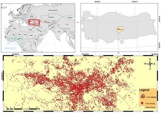 Kayseri, the focus of this study, is a major metropolitan city in the Central Anatolia Region of Turkey. Its urban fabric is highly heterogeneous—ranging from dense historic districts to rapidly developing suburban zones—overlaid by an evolving transportation network. These spatial complexities provide an ideal test bed for investigating the key determinants of fire-response performance, including traffic congestion, network accessibility, and the spatial distribution of different fire types.