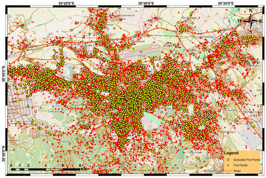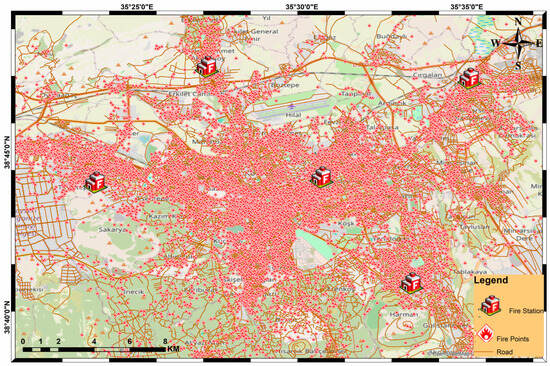 All fire incident records, fire-station coordinates, and road-network data are confined to the administrative boundaries of Kayseri Province. Figure 2 depicts the geographic dispersion of historical fire events alongside the locations of the five active municipal fire stations. This spatial configuration guided every stage of model development—data preprocessing, network calibration, model training, and validation—ensuring that the analytical results are directly relevant to the operational landscape of the Kayseri Fire Department.