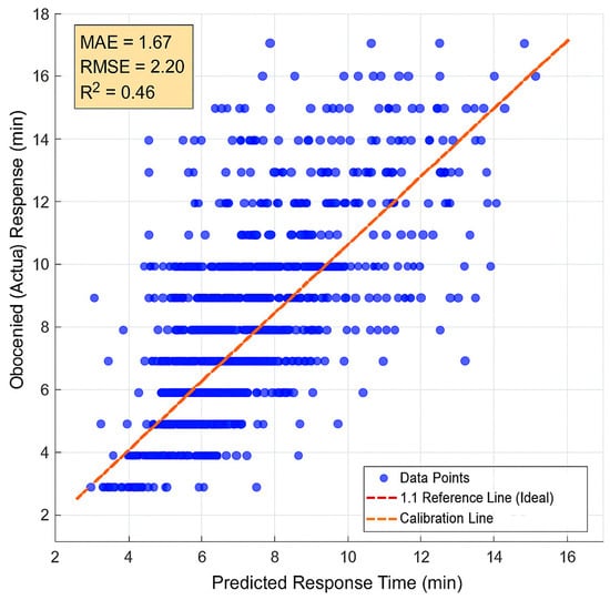 The scatter plot compares the model’s predicted response times (x-axis) against the actual, observed response times (y-axis) for the 1484 incidents in the test set. Each blue dot represents a single fire event. The dashed red line indicates the 1:1 line of perfect prediction, while the solid orange line shows the regression line of best fit. The clustering of points around the reference line demonstrates the model’s strong predictive performance. Key performance metrics are summarized in the inset box.