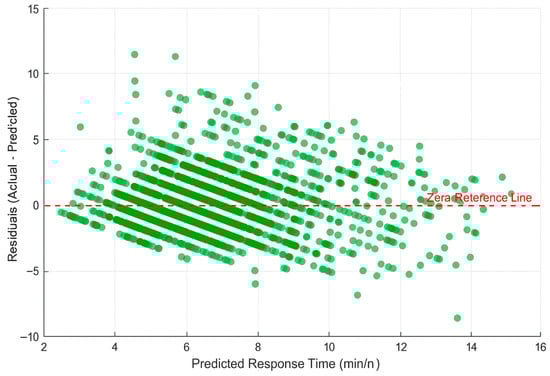 Residual Plot for the XGBoost Model. The plot shows the residuals (Actual—Predicted response time) on the y-axis against the predicted response times on the x-axis. The random scatter of points around the zero-error reference line (dashed red line) indicates that the model is not systematically biased. A slight increase in the spread of residuals for longer response times suggests mild heteroscedasticity, where the model’s prediction uncertainty grows for more distant or complex incidents.