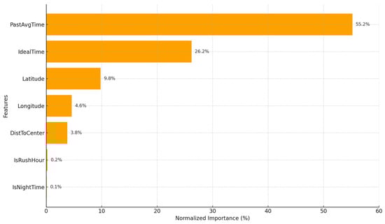 To enhance the interpretability of the XGBoost model and identify the key drivers of response time, a feature importance analysis was conducted (Figure 7). The analysis utilizes the “gain” metric, which measures the relative contribution of each feature to the model’s predictions. The results reveal that the KNN-derived PastAvgTime (55.2%) and the GIS-derived IdealTime (26.2%) are, by a significant margin, the two most influential predictors. This confirms our central hypothesis: the model’s strength comes from combining a physics-based network baseline (IdealTime) with empirical, learned ‘local knowledge’ (PastAvgTime). This finding reinforces the criticality of providing the model with a physics-based baseline for accuracy. Temporal attributes, particularly Hour of Day and the KNN-derived Past Average Time, also emerged as highly important features, highlighting the impact of predictable traffic patterns and localized, unobserved factors. The incident’s geographic coordinates (Latitude, Longitude) were also significant, demonstrating that the model learns distinct spatial patterns of response delays across the city.