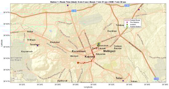 The shortest and fastest access routes from each fire station to incident locations were computed with Dijkstra’s algorithm on the routable OSM network described in Section 2.3.2. Figure 8 illustrates a representative case where the value of the integrated framework is demonstrated. For this incident, Dijkstra’s algorithm identified an optimal route with a theoretical ideal route time of 8 min and 5 s. The trained XGBoost model, incorporating learned local factors, predicted a more realistic arrival time of 7 min and 51 s. This prediction, falling very close to the ideal time, represents a scenario where the model successfully confirms a low-congestion route, providing dispatchers with high confidence in the estimate.