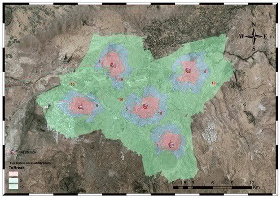 One of the major outcomes of the study was the spatial visualization and interpretation of these results using GIS. Accessibility zones around fire stations were delineated for multiple travel time thresholds (e.g., 3, 5, and 10 min) through service area (coverage) analysis [24]. Predicted response times and optimized routes were displayed using thematic maps, which revealed the spatial distribution of high-risk fire zones and areas with potential response delays. These maps are particularly valuable for emergency planners in identifying underserved regions and optimizing resource allocation.