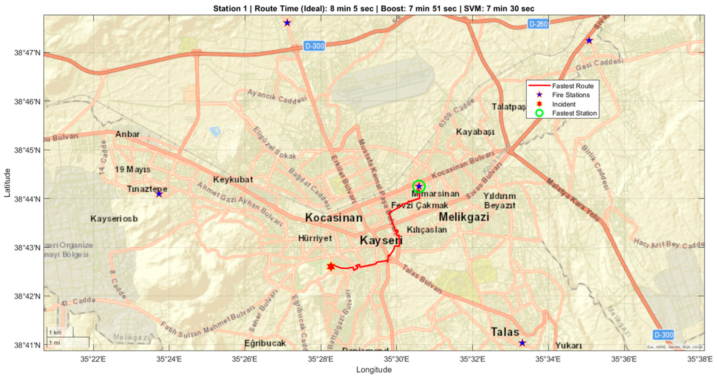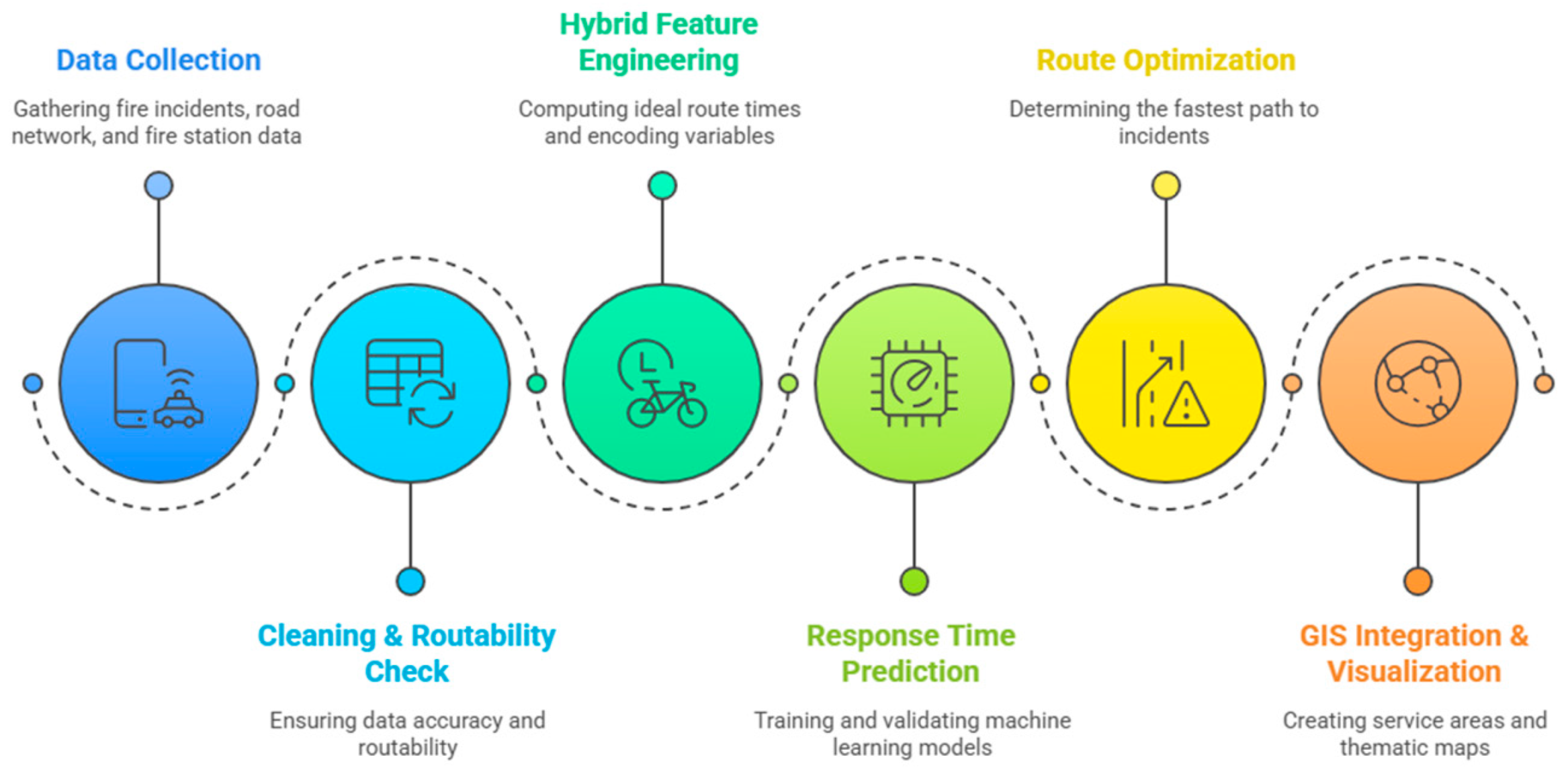This study implements a six-stage, GIS–ML pipeline to estimate fire department response times and to determine the shortest, time-efficient routes to incident locations (