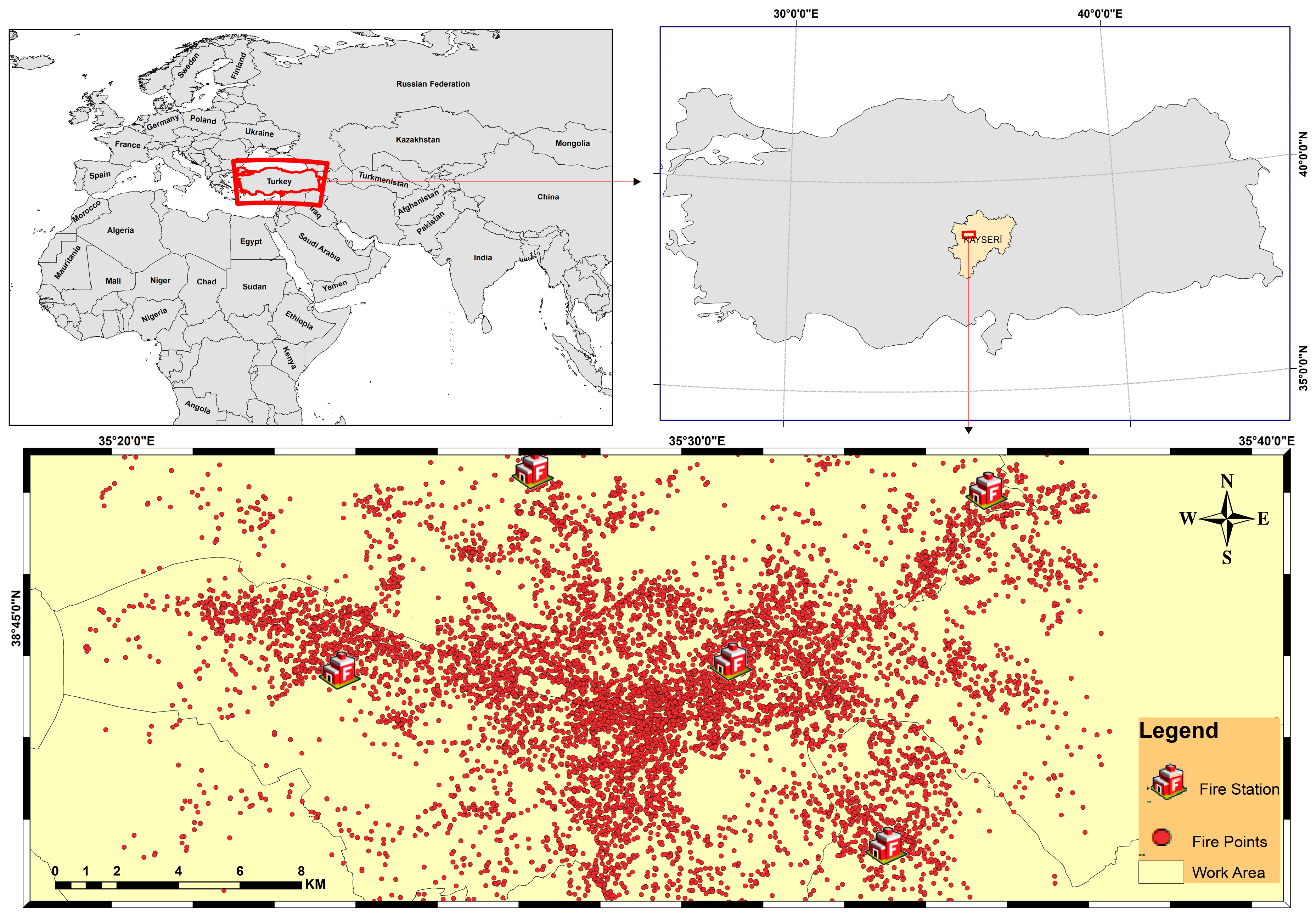 All fire incident records, fire-station coordinates, and road-network data are confined to the administrative boundaries of Kayseri Province.