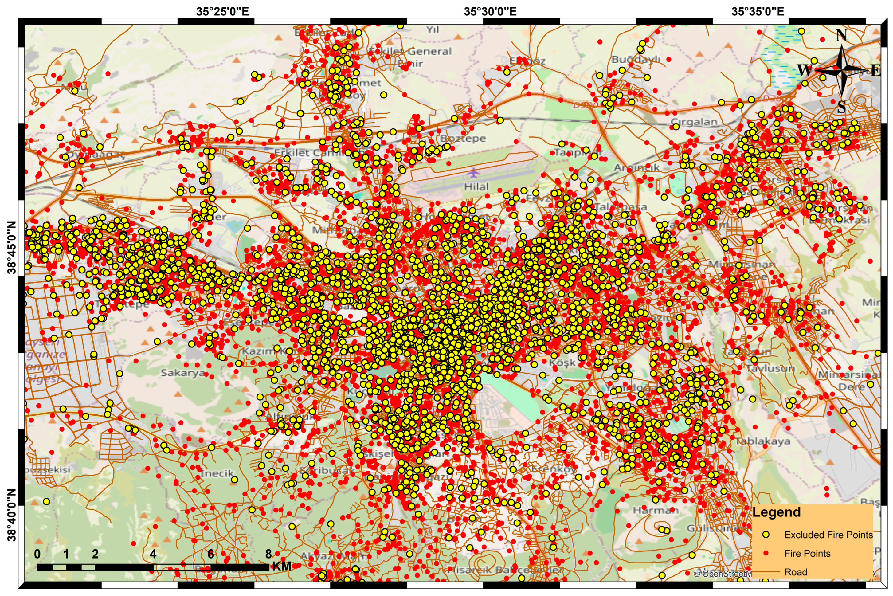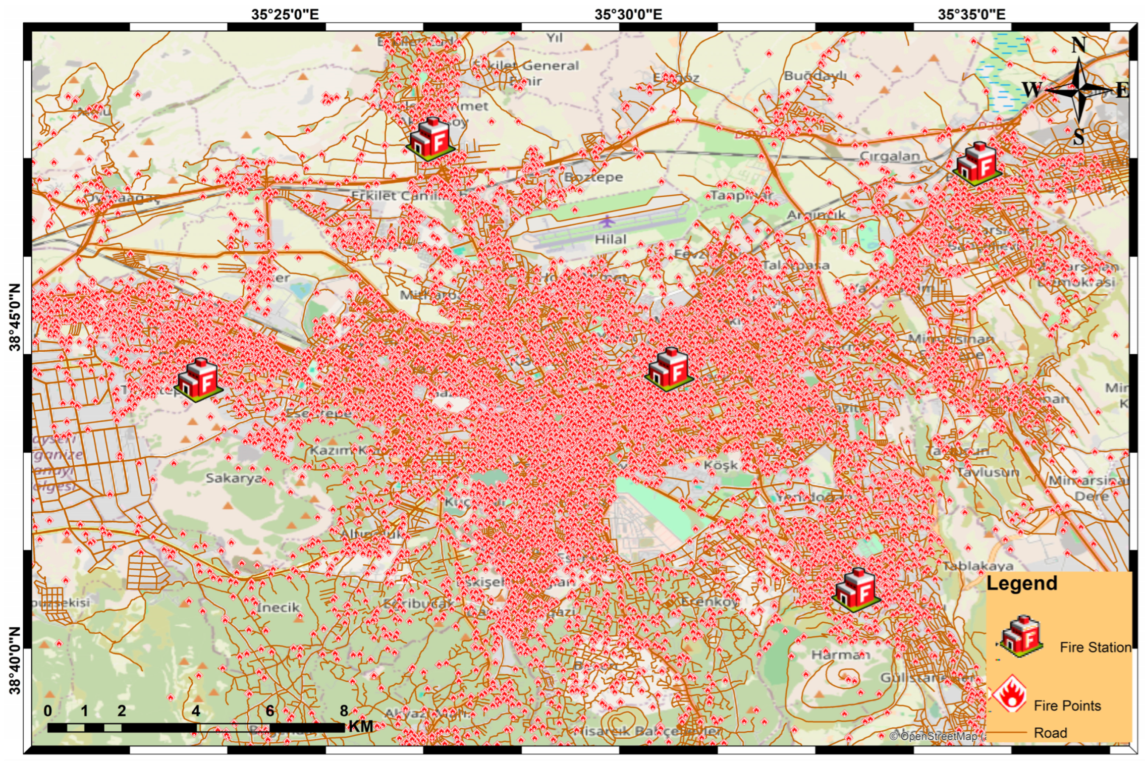 Figure 2 depicts the geographic dispersion of historical fire events alongside the locations of the five active municipal fire stations. This spatial configuration guided every stage of model development—data preprocessing, network calibration, model training, and validation—ensuring that the analytical results are directly relevant to the operational landscape of the Kayseri Fire Department.